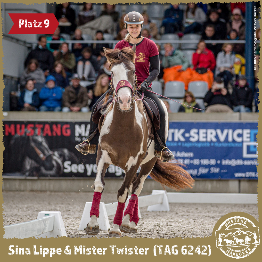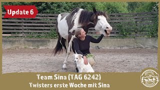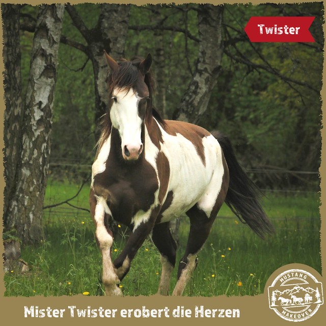 Besonderheiten: "Twister ist ein Mustang, der den Menschen liebt und sehr viel Spaß daran hat Neues zu lernen. Er ist total entspannt, auch beim Anreiten hat es Null Anspannung gegeben. Wenn er mal etwas nicht direkt versteht, wird er zwar kurz nervös, kommt aber sehr schnell wieder runter. Gibt man ihm klare Signale und bestätigt gute Antworten positiv, macht er total gut mit und saugt alles Neue auf wie ein Schwamm." Sina