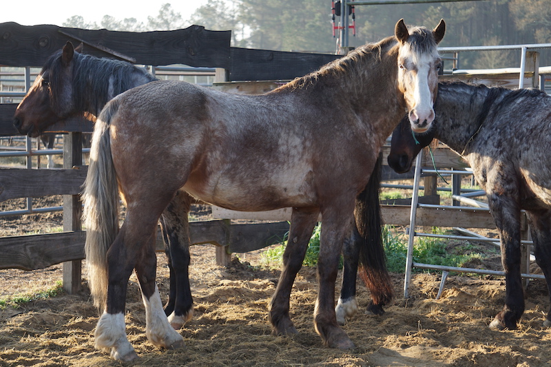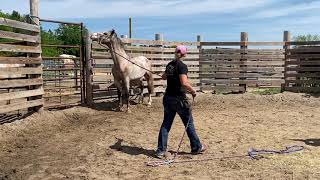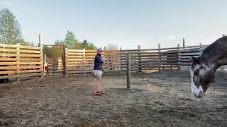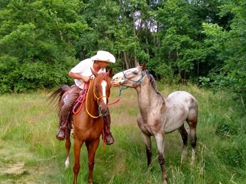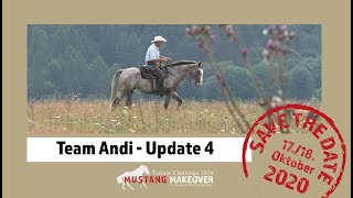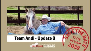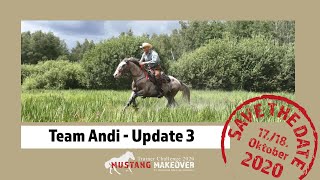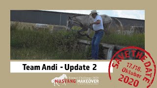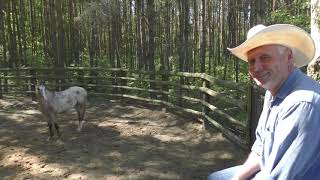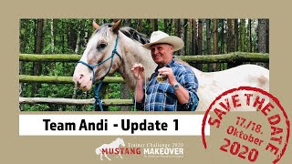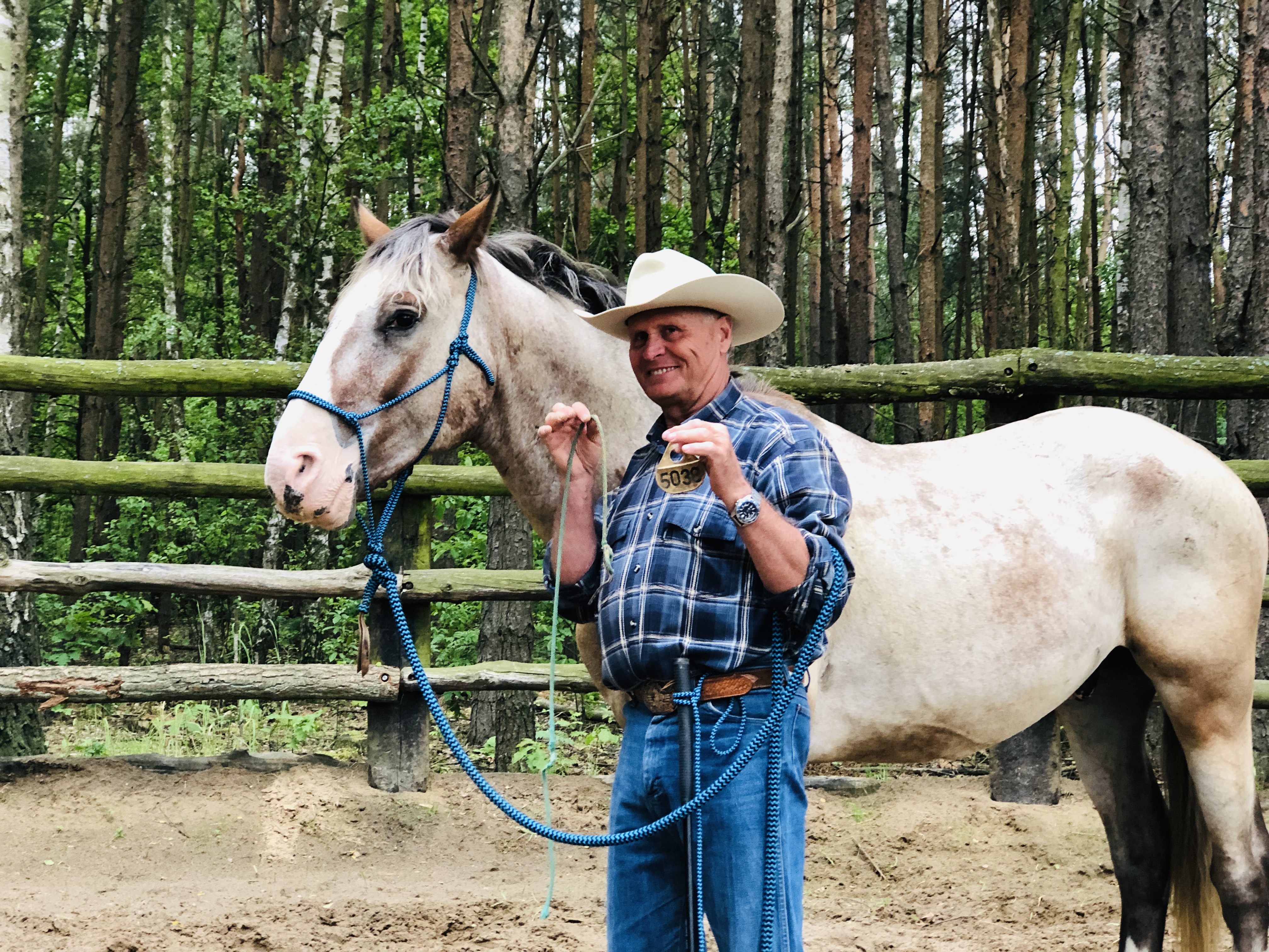 "Wir sind sicher Zuhause angekommen und konnten gut ausladen. Er war müde von der Reise. Am nächsten Tag nahm ich Kontakt zu ihm auf, aber er versuchte zu treten und zu beißen. Mit dem dritten Tag änderte er sich sehr, und er stimmte der ersten Berührung zu. Der erste Versuch mit dem Halfter war erfolglos, aber am fünften Tag war er bereit dafür. Ich fand, seine Lieblingsstelle zum Kratzen und er begann, mir zu folgen. Zunehmende Berührungen an seinem Körper und im Gesicht erlaubten es mir, ihn zu entwurmen. Langsam vermehrte ich frisches Gras, und als er bereit war, ließ ich ihn auf die Grasweiden hinausgehen. Er war so glücklich über den ersten Galopp auf offenem Gelände! Das war ein erstaunliches Bild. Er ist sehr unabhängig. Ruhig wie alle Mustangs. Er ruft nie andere Pferde. Ein bisschen Zeit mit guter Kommunikation gab mir eine perfekte Verbindung zu ihm. Am 10. Tag stellte ich ihm mein ältestes Pferd auf der Koppel vor. Er ging auf mein Pferd zu, drehte sich um, kam zu mir zurück und legte seinen Kopf auf meine Schulter! Das ist ein Zeichen der Freundschaft, was Pferde manchmal gegenseitig und auch bei vertrauenswürdige Menschen zeigen. Dies ist einer der unvergesslichen Momente! Die Hufe müssen dringend geraspelt werden - er erlaubte mir bereits, die Vorder- und Hinterbeine aufzuheben und zu berühren. Die Bindung ist jetzt so stark, dass er sogar trabend auf mich zu kommt, wenn er mich auf die Weide kommen sieht. Es gibt kein Problem damit, ihn zu führen. Ich arbeite an der Raumkontrolle mit ihm und verschiebe die Hinterhand. Ich habe es nicht eilig im Training und gebe ihm viel Entspannung und baue langsam die Grundlagen für eine vertrauensvolle Beziehungen auf. Und er hat mir bereits gesagt, dass dies der richtige Weg ist." Andi (JNBT Horsemanship Academy)