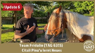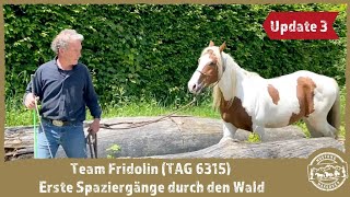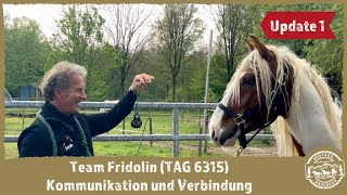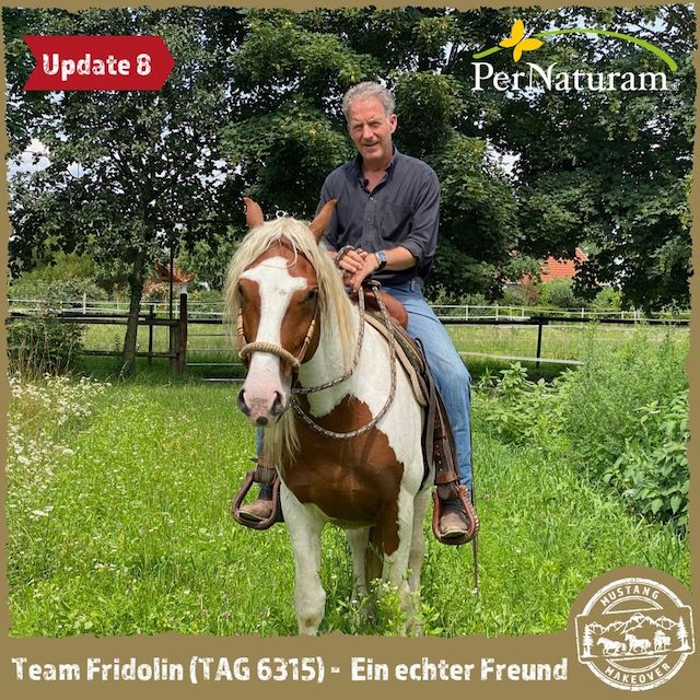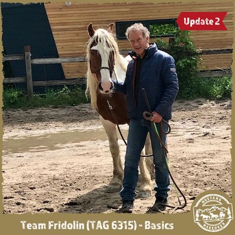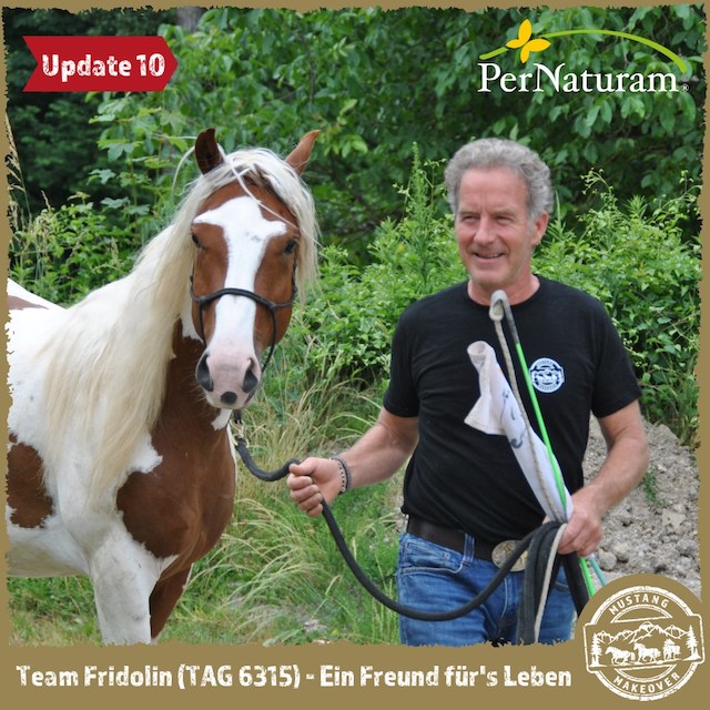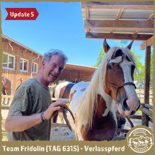 "TAG 6315 ging nach knapp 2 Wochen in die Herde. Jetzt steht er mit 8 Pferden zusammen im Bewegungsstall und geht mit allen auf die Koppeln. Er hat sich gleich eine ranghohe Stellung verschafft und kann jetzt fressen wo er will. Er lässt sich einfangen, das Halfter anlegen und herumführen. Beim Führen im Freien ist er noch etwas zögerlich. Aber vollkommen unaufgeregt. Im Training ist er sehr gelassen, gestern konnte ich ihm die Mähne striegeln. Die Bürste akzeptiert er schon am ganzen Körper. Nur die Füße. Die schützt er noch und gibt sie noch nicht freiwillig her. Aber Berührung mit dem Stick kann er schon ertragen." Fridolin