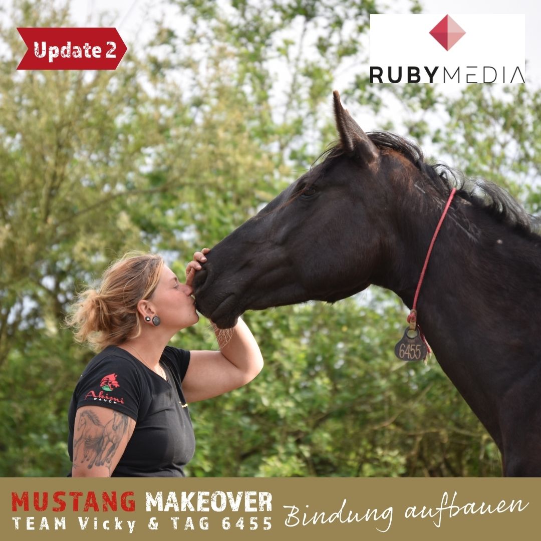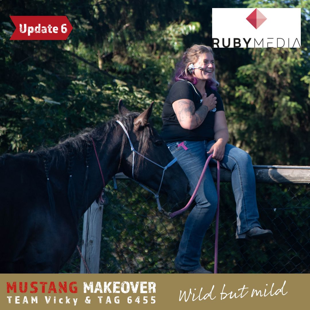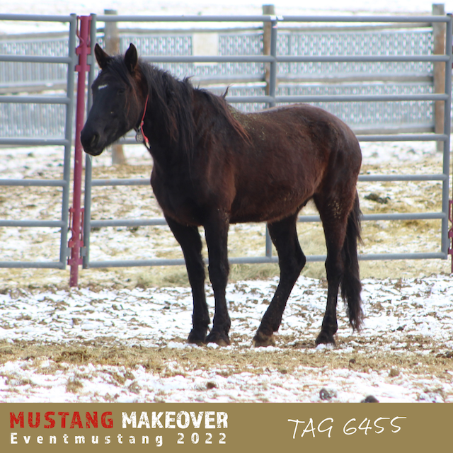 „TAG 6455 findet ihre Ruhe in der Herde und sie entspannt sich mehr auf der Weide, das bedeutet gute mentale Ruhe... Sie verändert sich und anstatt zu erstarren, ist sie selbstbewusster. Für mich ist es ein neues Pferd, das ich kennenlerne, und deshalb muss ich meine Herangehensweise an sie anpassen. Ich bin ihr dankbar, dass sie mir diese Veränderung gezeigt hat. Es bedeutet, dass ich mehr an mir selbst als Trainer arbeiten muss und es bedeutet, dass sie geistig so sehr wächst.Wir arbeiten immer noch an Vertrauen und Berührungen, das macht sie sehr nervös und manchmal abwehrend. Das ist im Moment unser größter Fokus, wir wollen nicht vorschnell handeln, denn unsere Sicherheit ist das wichtigste. Sie ist sehr sanft, wenn sie sich in ihrer Komfortzone befindet, sie möchte mit einem zusammen sein und möchte einem mit jedem Schritt gefallen, den sie macht. Sie liebt es, neue Dinge auszuprobieren. Wir haben eine Applaus-Veranstaltung gemacht, und kurz bevor wir unsere Vorführung machten, beschloss der Schmutzfink, dass sie zuerst ein Schlammbad brauchte! Sie wälzte sich im Schlamm, während alle Leute ihr zusahen, sie wälzte sich ein Dutzend Mal, das brachte mich zum Lachen. Ihre Vorführung verlief großartig, die Bilder waren alle ein wenig schlammig :p