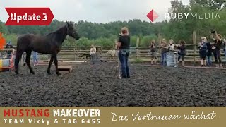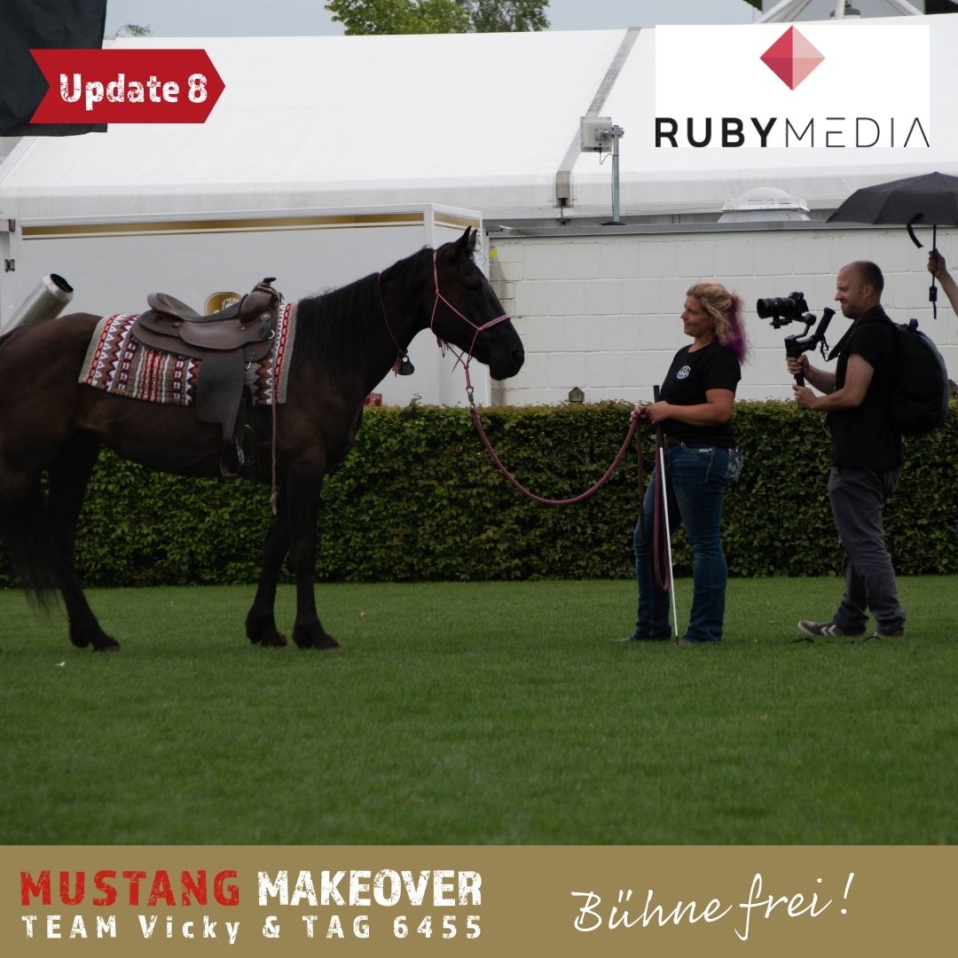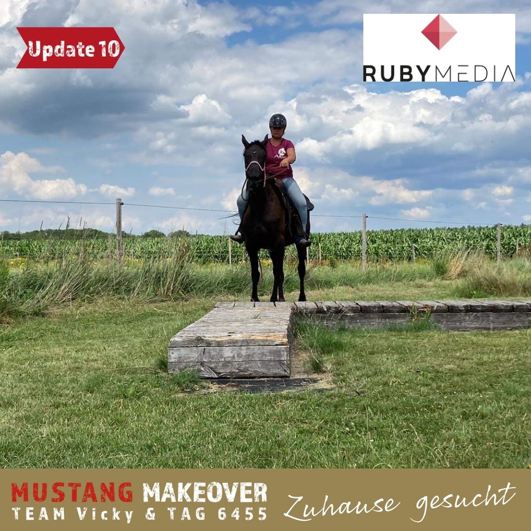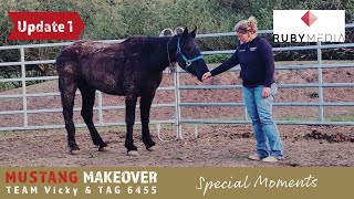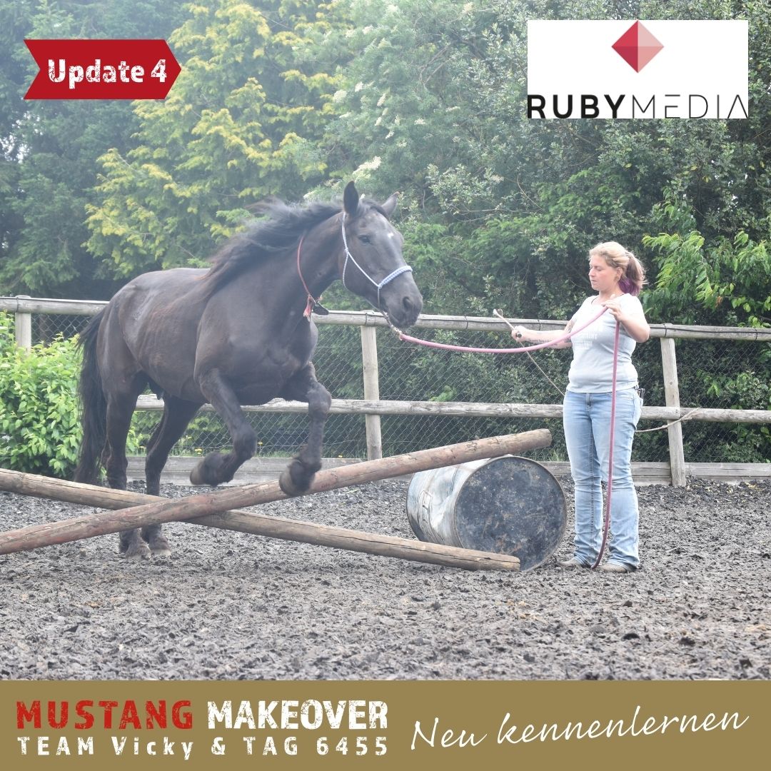 „TAG 6455 findet ihre Ruhe in der Herde und sie entspannt sich mehr auf der Weide, das bedeutet gute mentale Ruhe... Sie verändert sich und anstatt zu erstarren, ist sie selbstbewusster. Für mich ist es ein neues Pferd, das ich kennenlerne, und deshalb muss ich meine Herangehensweise an sie anpassen. Ich bin ihr dankbar, dass sie mir diese Veränderung gezeigt hat. Es bedeutet, dass ich mehr an mir selbst als Trainer arbeiten muss und es bedeutet, dass sie geistig so sehr wächst.Wir arbeiten immer noch an Vertrauen und Berührungen, das macht sie sehr nervös und manchmal abwehrend. Das ist im Moment unser größter Fokus, wir wollen nicht vorschnell handeln, denn unsere Sicherheit ist das wichtigste. Sie ist sehr sanft, wenn sie sich in ihrer Komfortzone befindet, sie möchte mit einem zusammen sein und möchte einem mit jedem Schritt gefallen, den sie macht. Sie liebt es, neue Dinge auszuprobieren. Wir haben eine Applaus-Veranstaltung gemacht, und kurz bevor wir unsere Vorführung machten, beschloss der Schmutzfink, dass sie zuerst ein Schlammbad brauchte! Sie wälzte sich im Schlamm, während alle Leute ihr zusahen, sie wälzte sich ein Dutzend Mal, das brachte mich zum Lachen. Ihre Vorführung verlief großartig, die Bilder waren alle ein wenig schlammig :p