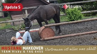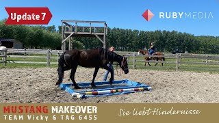 "TAG 6455 macht sich so gut! Ich erinnere mich an ihre Beschreibung ihres Charakters und ich muss sagen, dass sie mich in jeder Hinsicht überrascht hat. Sie ist so eine sanfte Seele, aber auch neugierig. In der letzten Woche haben wir gemeinsam an unserer Bindung gearbeitet, sie fängt jetzt an, Menschen zu mögen. Sie vertraut mir auf Schritt und Tritt. Ich kann es kaum erwarten, zu sehen, wie sie sich zu dem wunderschönen Pferd entwickelt, das sie ist! Wir haben auch angefangen, an unserem Zirkeln zu arbeiten und am Seil zu arbeiten. Sie ist so ein schlaues Mädchen! Nach nur 2 Fragen wusste sie schon die Antwort. Auch das Bewegen der Hinterbeine und der Vorderbeine ist für sie ein Kinderspiel. Hindernisse beeindrucken sie nicht im Geringsten. Sie ist einfach perfekt!" - Vicky