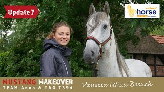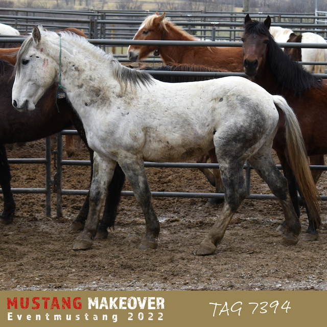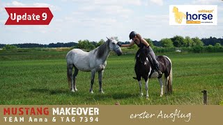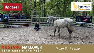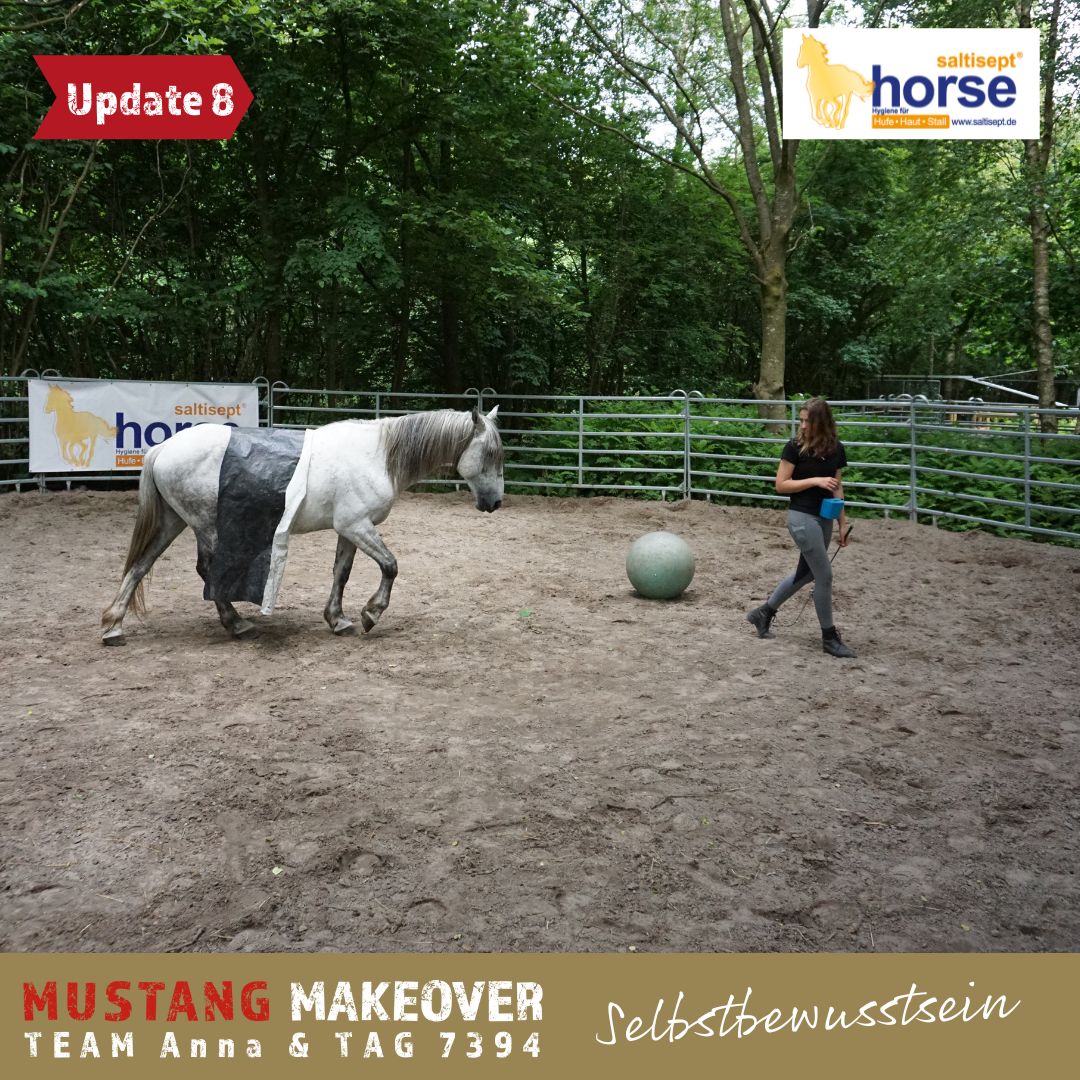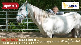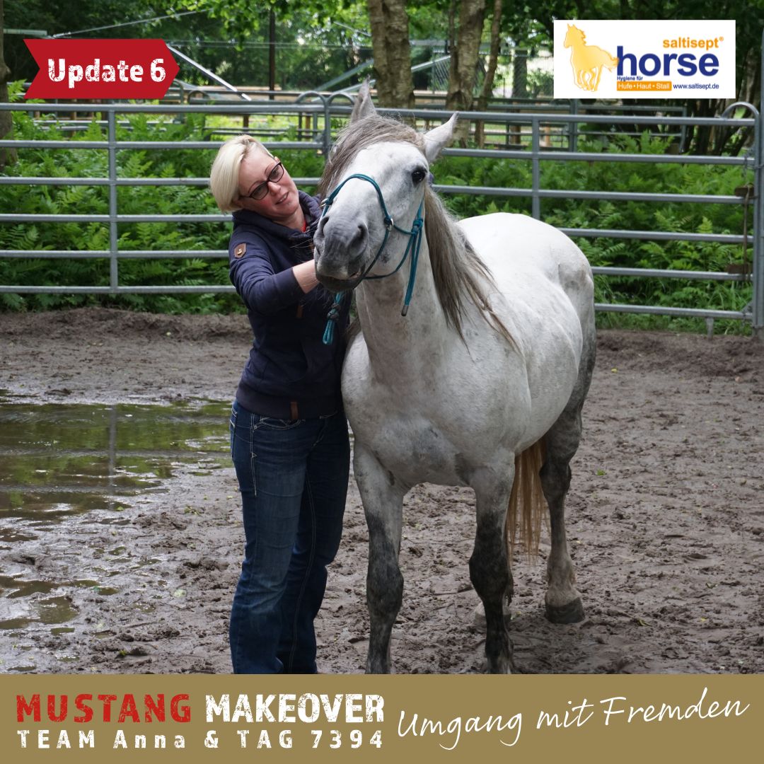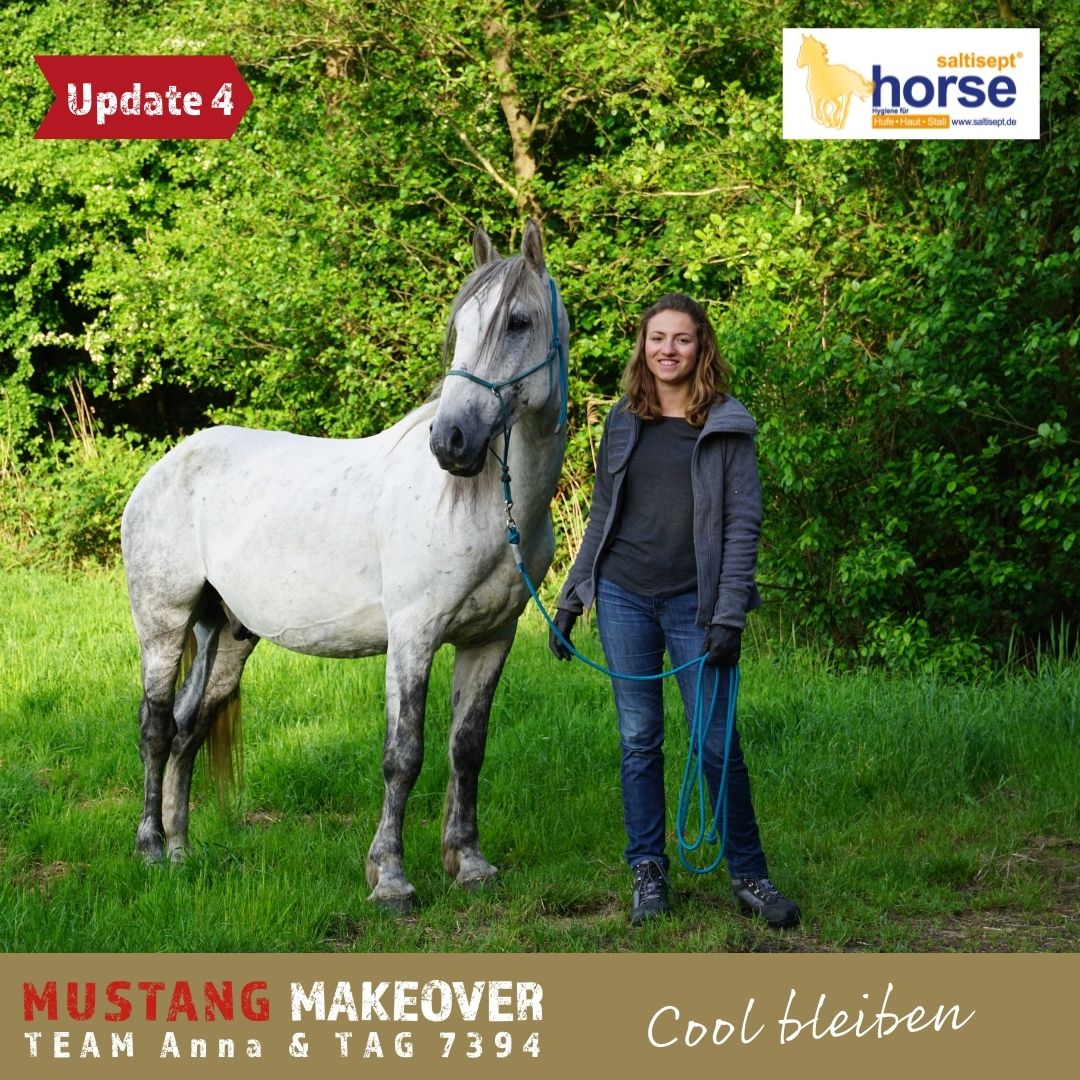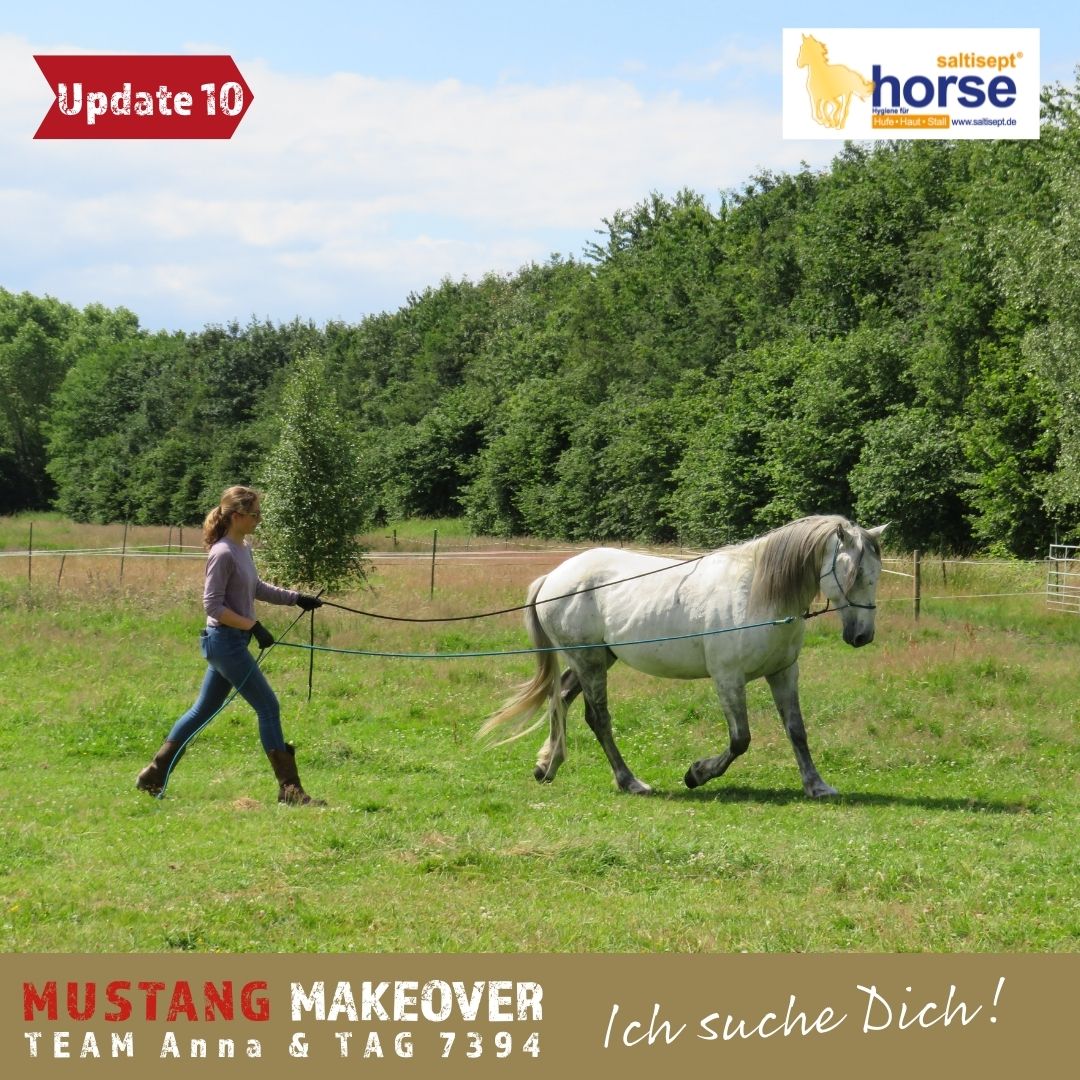 "Wir gewöhnen uns immer mehr aneinander und er genießt die Nähe. TAG 7394 verbringt viel Zeit auf der Weide und hat sich schon richtig mit meinem Mustang Sky angefreundet. Im Training hat er seine Skepsis dem Menschen gegenüber verloren und findet auch alles andere nur kurzfristig gruselig. Er beeindruckt dadurch, dass er immer einen kühlen Kopf bewahrt. So war zum Beispiel das Pad kein Problem für ihn und der Gurt störte ihn nicht. Wir gucken uns in Ruhe den Hof an und sind spazieren. Auch das Verladetraining haben wir gestartet. Es macht Spaß mit ihm zu arbeiten!" - Anna